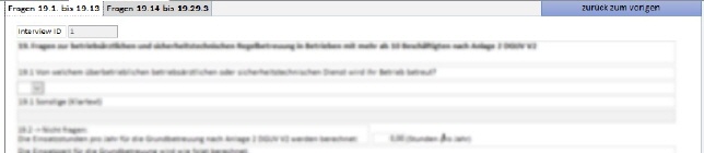 Die Navigation im Interview wird sowohl über die Register, welche die Frageblöcke in mehrere Seiten aufteilt und damit strukturiert, realisiert: |
