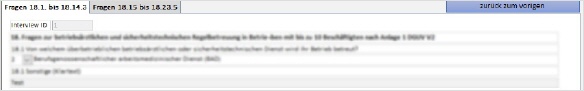 Die Navigation im Interview wird sowohl über die Register, welche die Frageblöcke in mehrere Seiten aufteilt und damit strukturiert, realisiert: